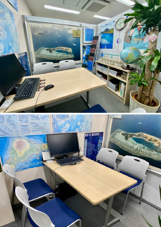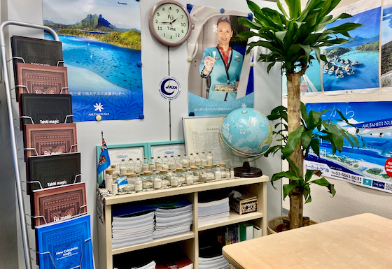 お打合わせコーナーには、スタッフの視察旅行土産「南太平洋の砂」などもディスプレイ。南太平洋らしさでいっぱいのトーホートラベルへ、ぜひお気軽にご来店ください!スタッフ一同、お客様のご来店を心よりお待ちしております。