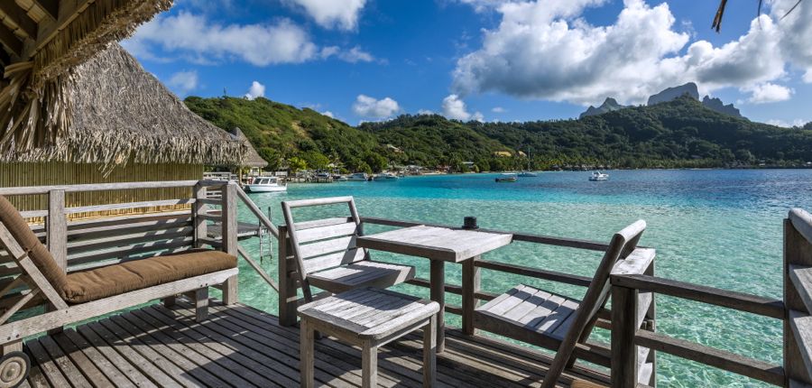 ボラボラ島の南端、ワールドベストビーチにも輝いた屈指の美しさを誇る、マティラ岬に一等地に位置するリゾート。客室はパンダナスを織り込んだ壁のタヒチらしさを満喫できる伝統的ポリネシアンスタイル。50棟ある水上バンガローは、大人の人が立って歩けるほど浅いラグーンに囲まれているため、泳ぎに自信がない方も安心して熱帯魚が泳ぎ回る海を楽しめる。同じボラボラ島にある姉妹ホテル「インターコンチネンタル・ボラボラリゾート&タラソスパ」との間を一日9便の有料シャトルボートが運行し、レストランや最新スパ施設などを利用できる(要予約)など、ひとつで2度おいしいリゾートだ。夕暮れ時は抜群のロケーションのビーチで、ロマンティックなサンセットを満喫したい。