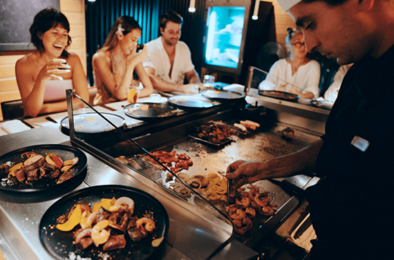 日本式の鉄板焼きスタイルの小さなレストランです。目の前でシェフが腕を振るって調理をしてくれますので、食事のみならず、同席の他のお客さまとの会話も弾むでしょう。 -