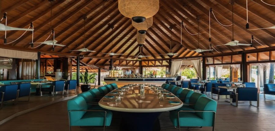 ビーチを見渡すブールサイドにあるビュッフェスタイルのメインレストラン。南の島らしさ溢れるサンドカーペットのテラス席もあり、世界各国の料理やエイジャン料理を提供しています。 -