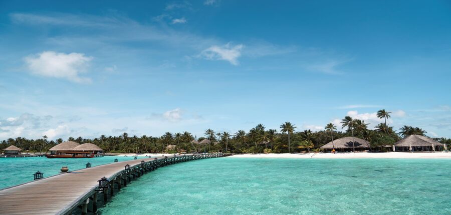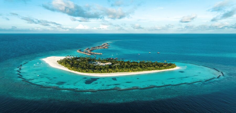モルディブの伝統的な船「ドーニ」の形をした島を囲むターコイズブルーの海と白砂のビーチ、整えられた緑のガーデンが織りなすコントラストは、まるで時が止まったかのような癒しの空間。半円型の島の西側にはプライベートプール付きの水上ヴィラが弧を描き、850mにも及ぶ長い桟橋の途中には水上スパやレストランなどの施設が点在します。珊瑚の美しいハウスリーフや近くのドロップオフもあり、海のアクティビティも充実しています。