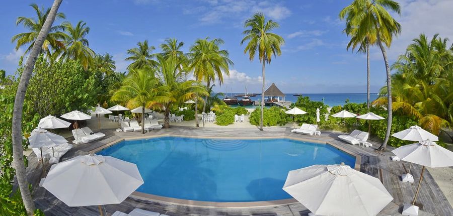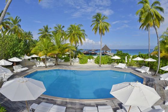 高級リゾートだったムシマスミギリ島が6年前に変身。水上、ビーチに全84室、オールインクルーシブでリーズナブルに水上ヴィラに泊まれるナチュラル感のあるカジュアルリゾートとして生まれ変わった。シュノーケリングとダイビングが面白く、魚の多いドロップオフへ5つのパッセージから出られる。食事は爽やかな白いテント屋根の水上レストランでいただくビュッフェスタイル。カジュアルでアットホームな雰囲気の中、気取らずにゆったりと過ごせる快適さが心地よい。