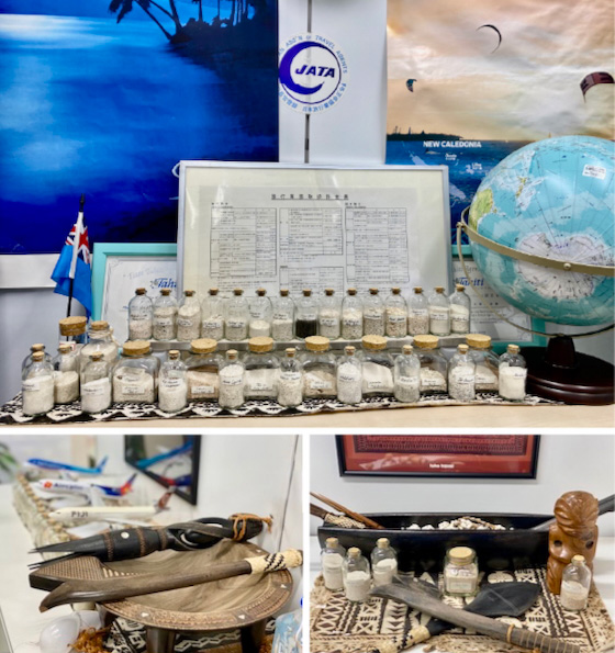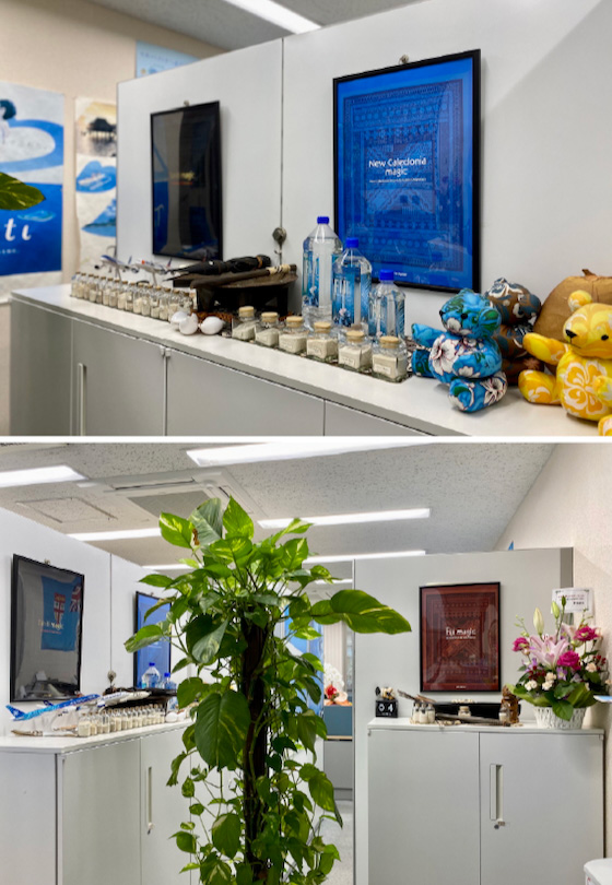 お打合わせコーナーには、スタッフの視察旅行土産「南太平洋の砂」などもディスプレイ。南太平洋らしさでいっぱいのトーホートラベルへ、ぜひお気軽にご来店ください!スタッフ一同、お客様のご来店を心よりお待ちしております。