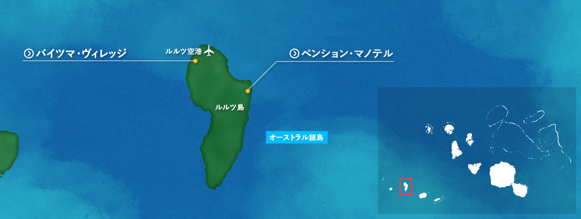 タヒチ島の南約660kmの場所に位置する「ルルツ島」は、1周30kmの未開拓の小さな島でありながら、「ザトウクジラと一緒に泳げる島」として世界中のダイバーや水中フォトグラファーから注目されています。島には高級リゾートはなく、クジラ目当てのダイバーが泊まる素朴なペンションが数軒。大らかで優しいタヒチアンと出会いも温かく、素朴な生活が垣間見られます。